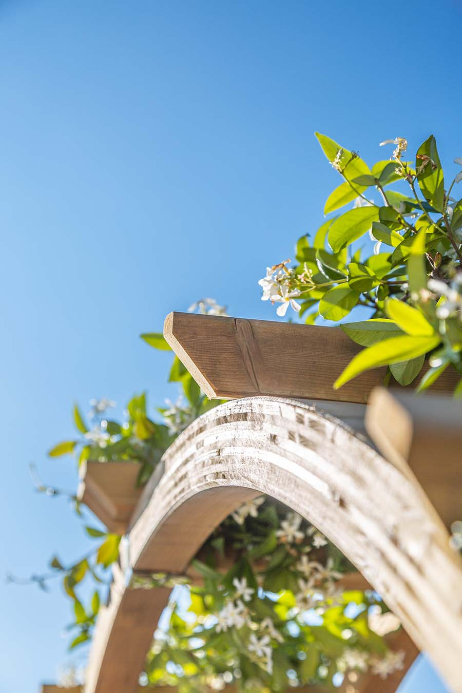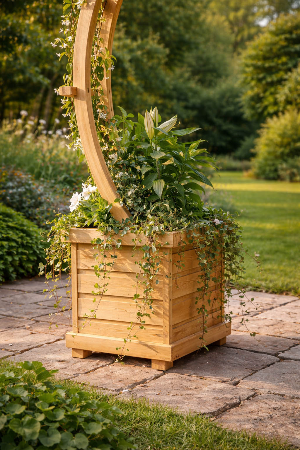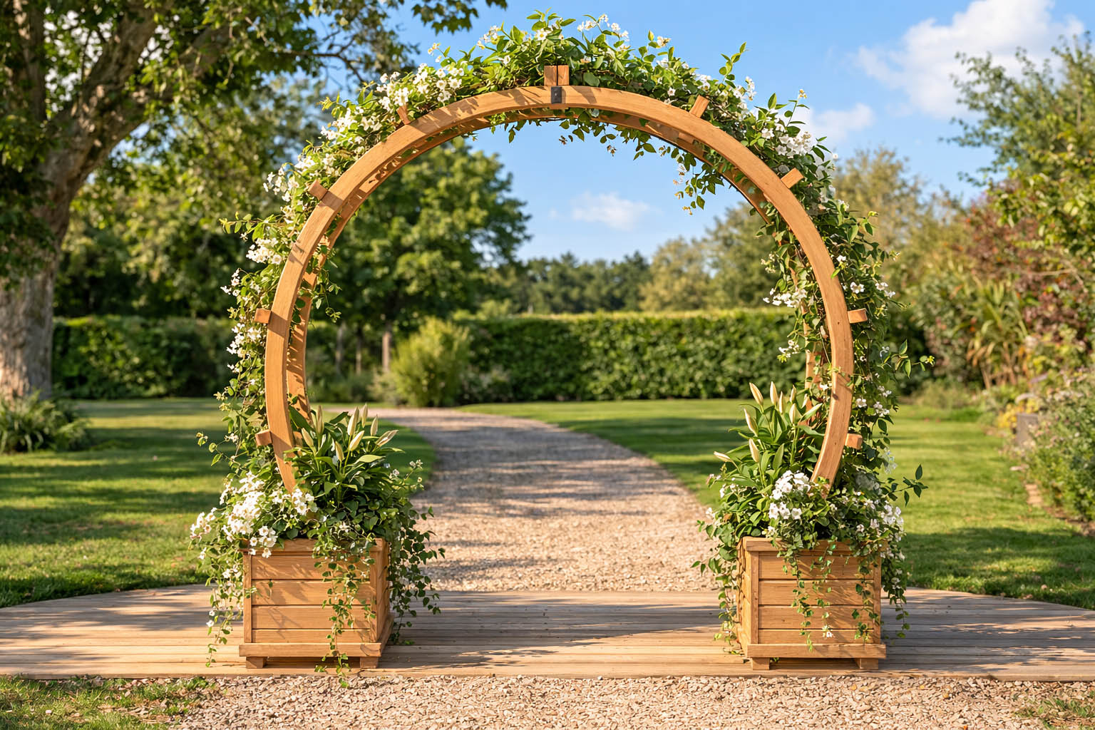At its base, two integrated timber planter boxes provide the perfect place to grow fragrant roses, cascading clematis, or a colourful mix of seasonal flowers. These planters not only anchor the arch visually but also offer an immediate sense of life and abundance.